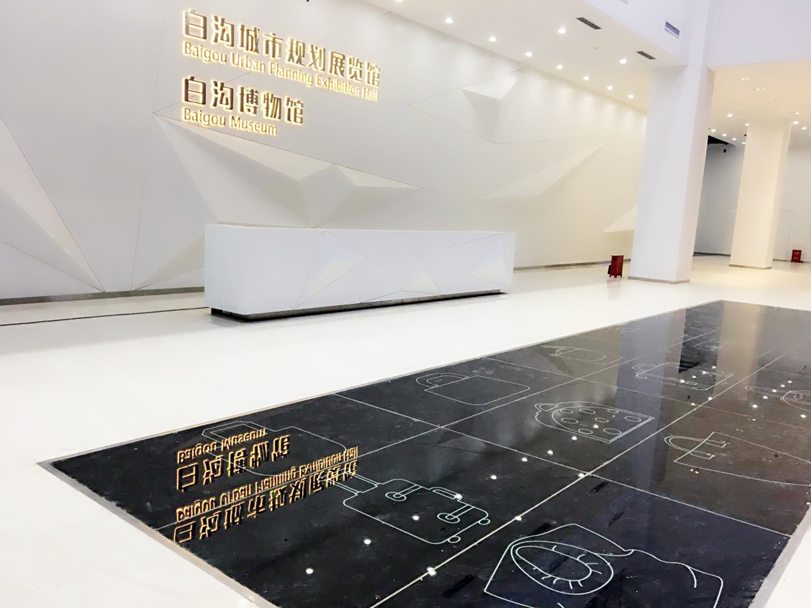 箱包是白溝的重點產業、商貿基礎,展館公共大廳設計中以箱包配飾、零部件為頂面、墻面不規則立體造型,地面以簡筆畫突出箱元素,施工中從隔墻基層、油漆基層到底漆、面層漆,每一步都進行嚴格的質量與進度把控,尤其在地面簡筆畫板塊施工中,項目部根據以往施工經驗反復論證,尋求最佳方案,最終做成黑色烤漆箱包造型玻璃材質,保證了絕好的實際效果。