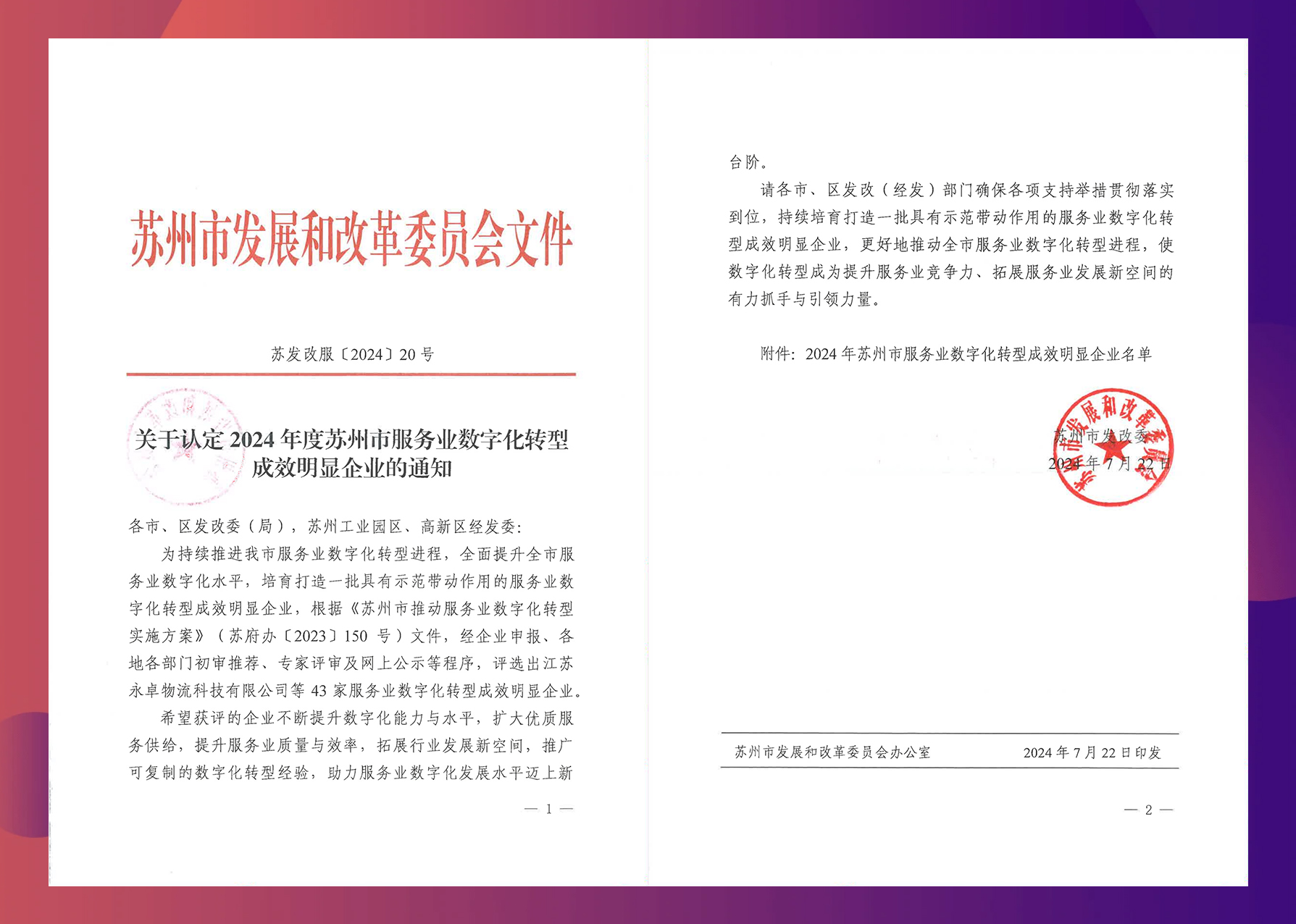 7月22日,蘇州市發改委發布了“2024年蘇州市服務業數字化轉型成效明顯企業”認定名單,金螳螂文化憑借顯著的數字化轉型成效與廣泛的行業影響力脫穎而出,榮獲此殊榮。