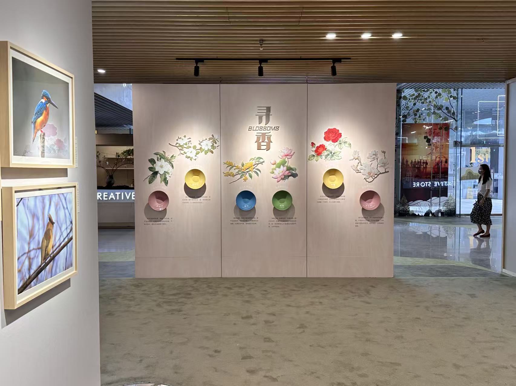 展覽核心區(qū)域通過攝影作品與互動裝置相結合,觀眾可依次體驗“綠境啟程、鳴聲識鳥、聞香識花、林間探鳴”等多感官互動裝置,形成視覺、聽覺與嗅覺的沉浸式體驗。